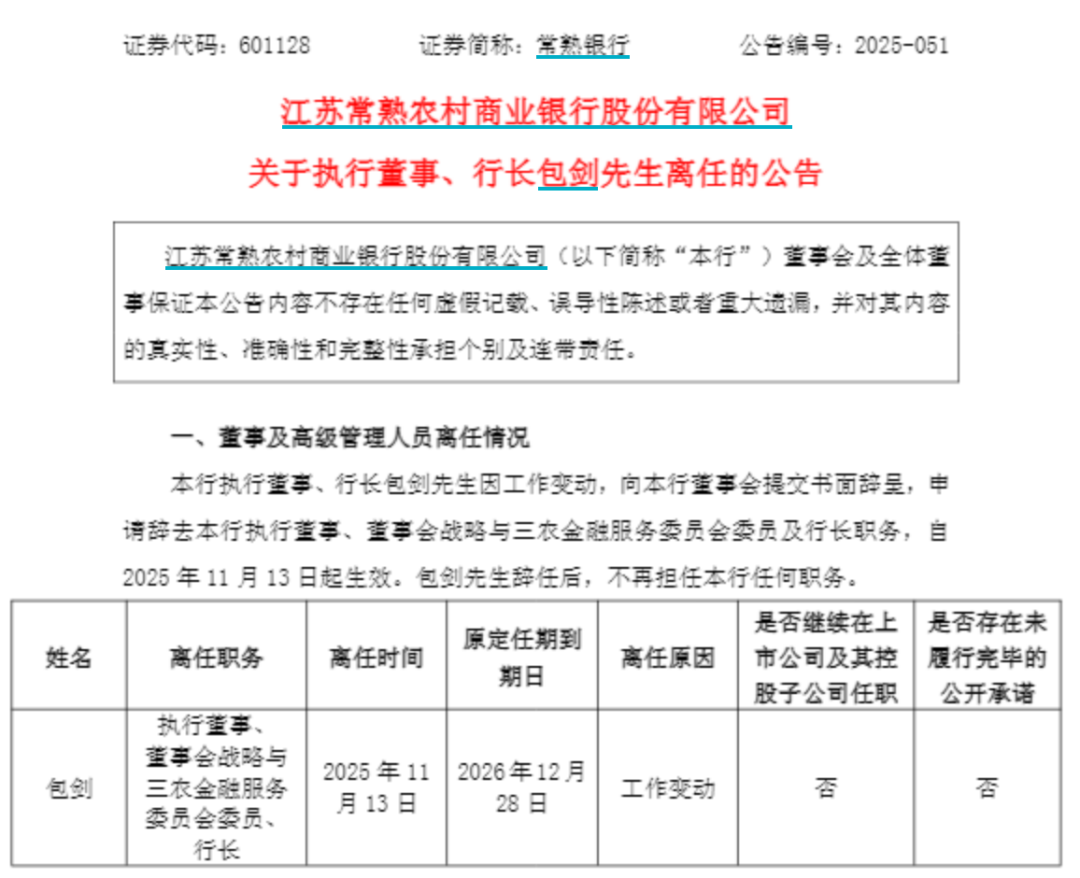 同日,常熟银行的另一位副行长李勇,也因工作变动,申请辞去副行长职务,自2025年11月13日起生效。李勇辞任后,亦不再担任常熟银行任何职务。